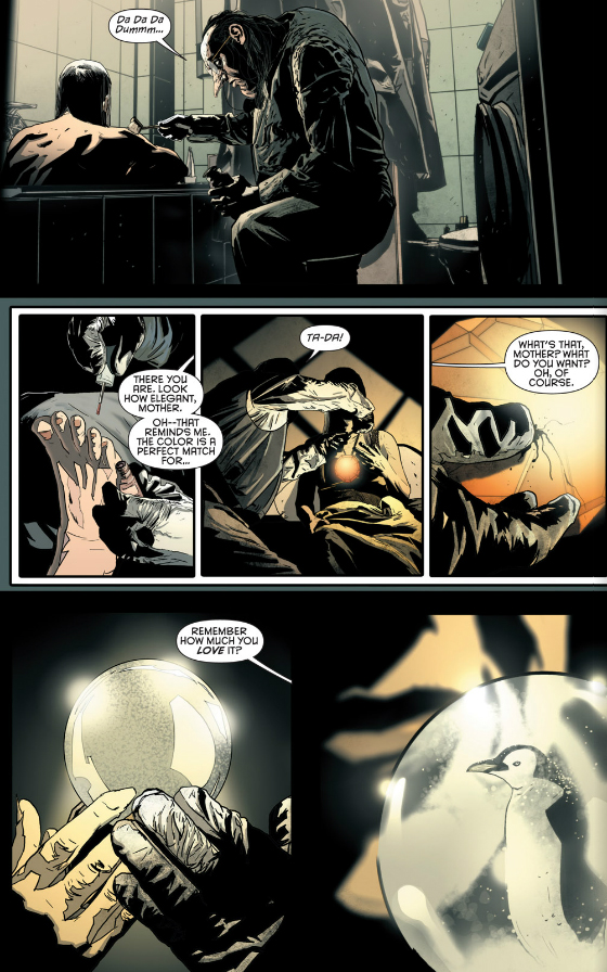 毎度のように絵にみとれてしまい話あまり読んでないんですが、おかしな鼻のせいで子供の頃から虐げられていたっぽい、映画「バットマンリターンズ」でもヴィランなのに始終かわいそうな人って印象があったペンギン。